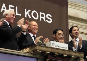 Designer Michael Kors (2nd L) celebrates after ringing the opening bell with guests of Michael Kors Holdings Ltd. at the New York Stock Exchange December 15, 2011. REUTERS/Brendan McDermid